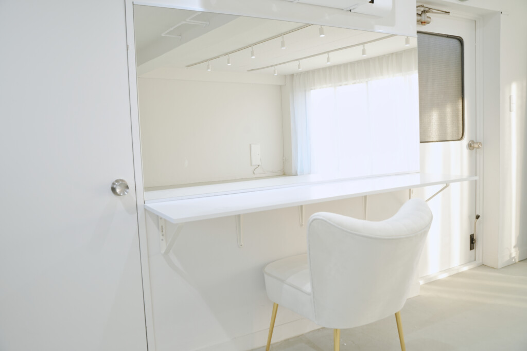 - メイクドレッサー:大型ミラー完備。2名同時施術が可能な広々としたデスク。